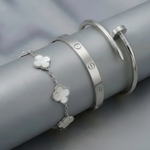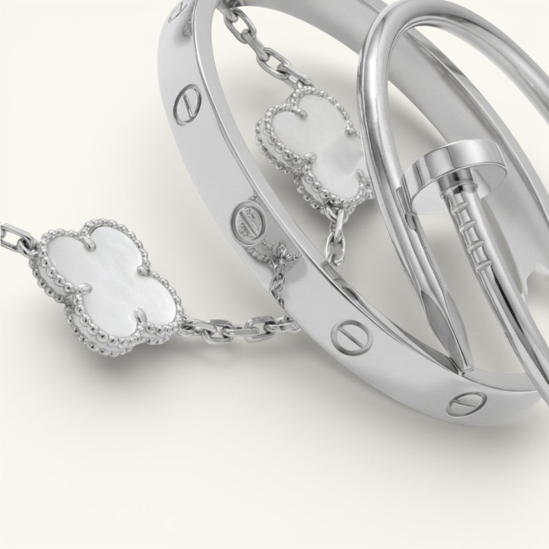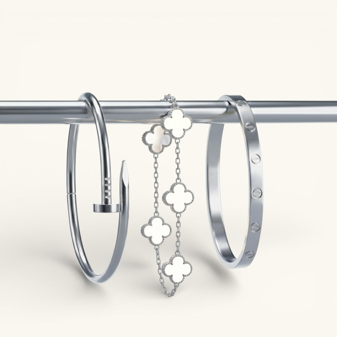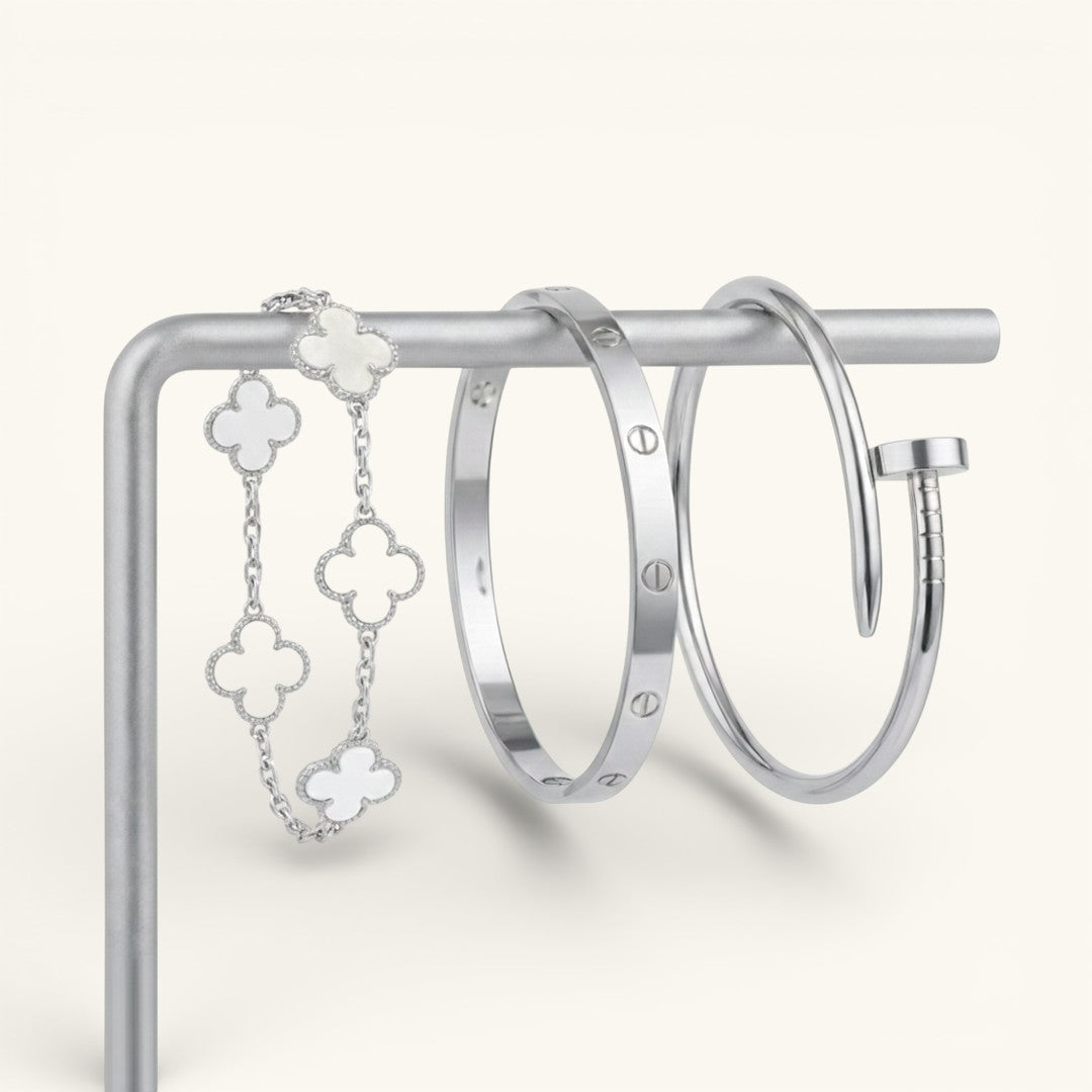 Deze bundel biedt de perfecte balans tussen minimalistische charme en krachtige verfijning, en is daarmee een ideale aanvulling op je sieradencollectie of een doordacht cadeau voor iemand die je dierbaar is.