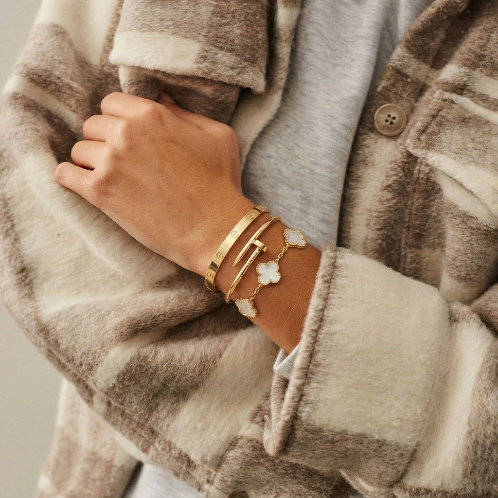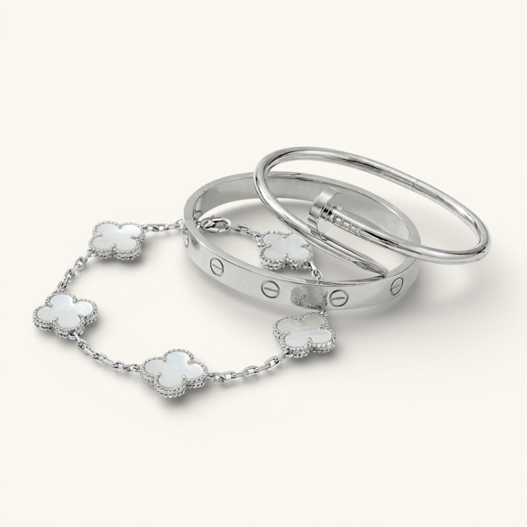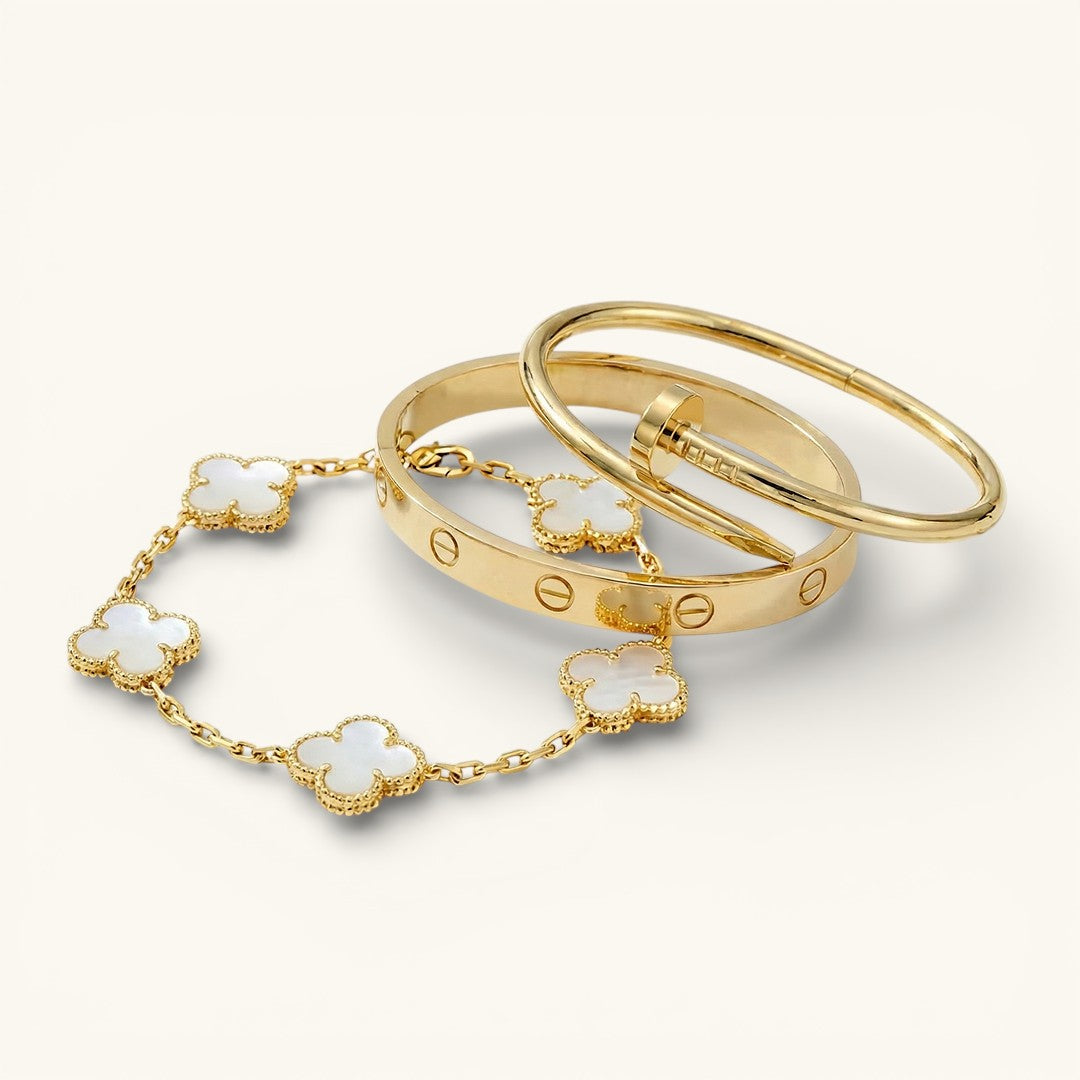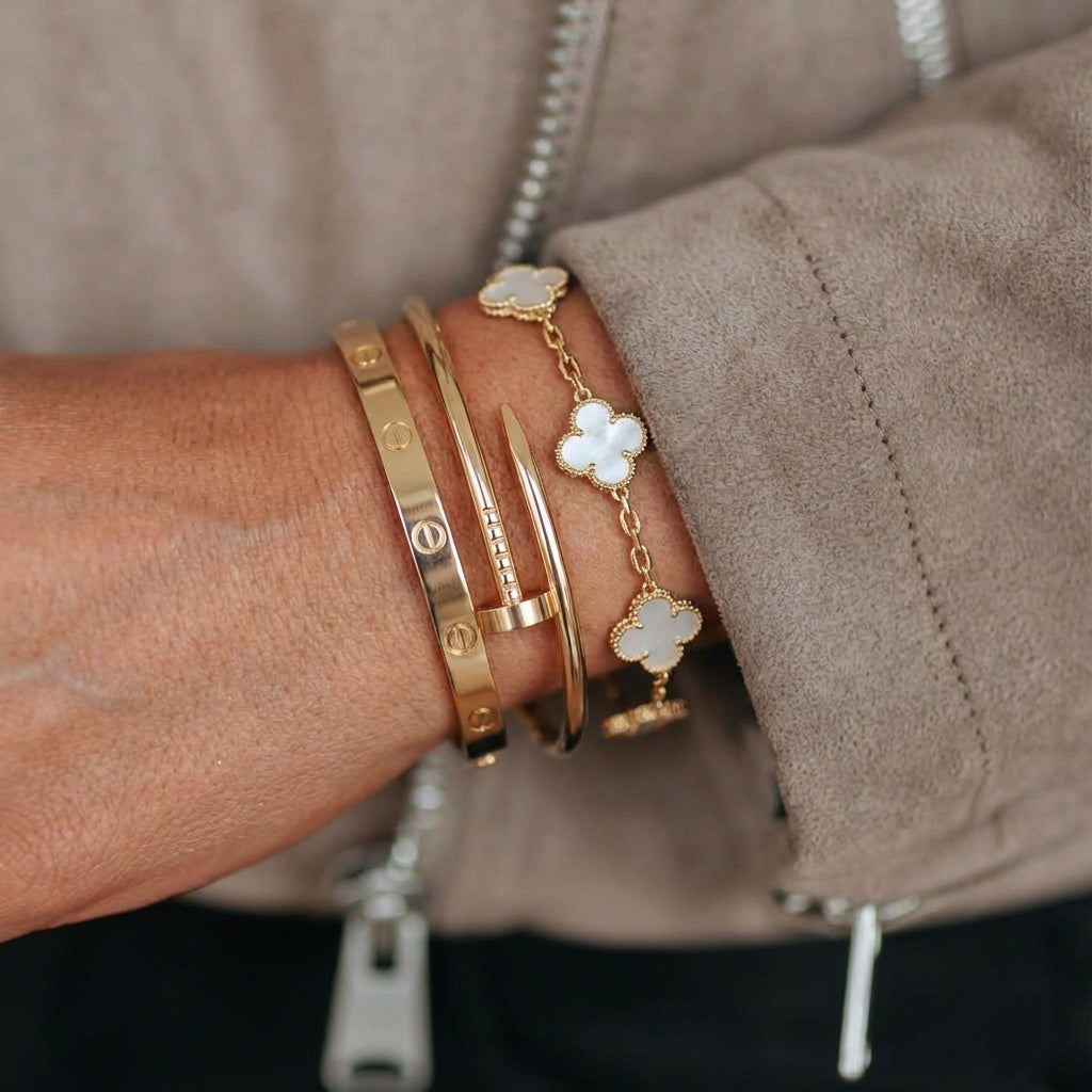 - Trinity & Clover Armband: Een delicate en verstelbare armband (16 + 5 cm) met charmante details, verkrijgbaar in goud of zilver.