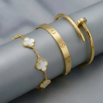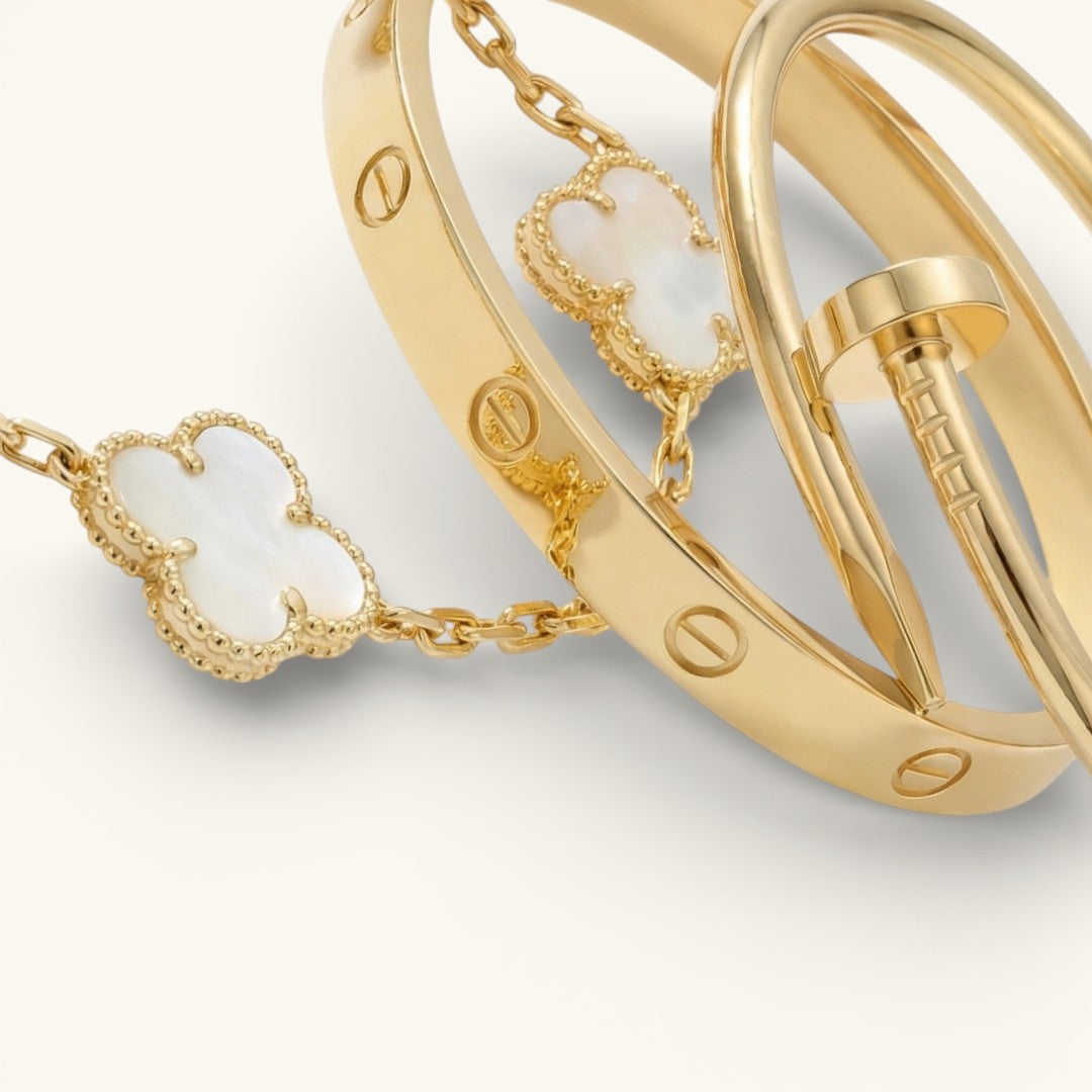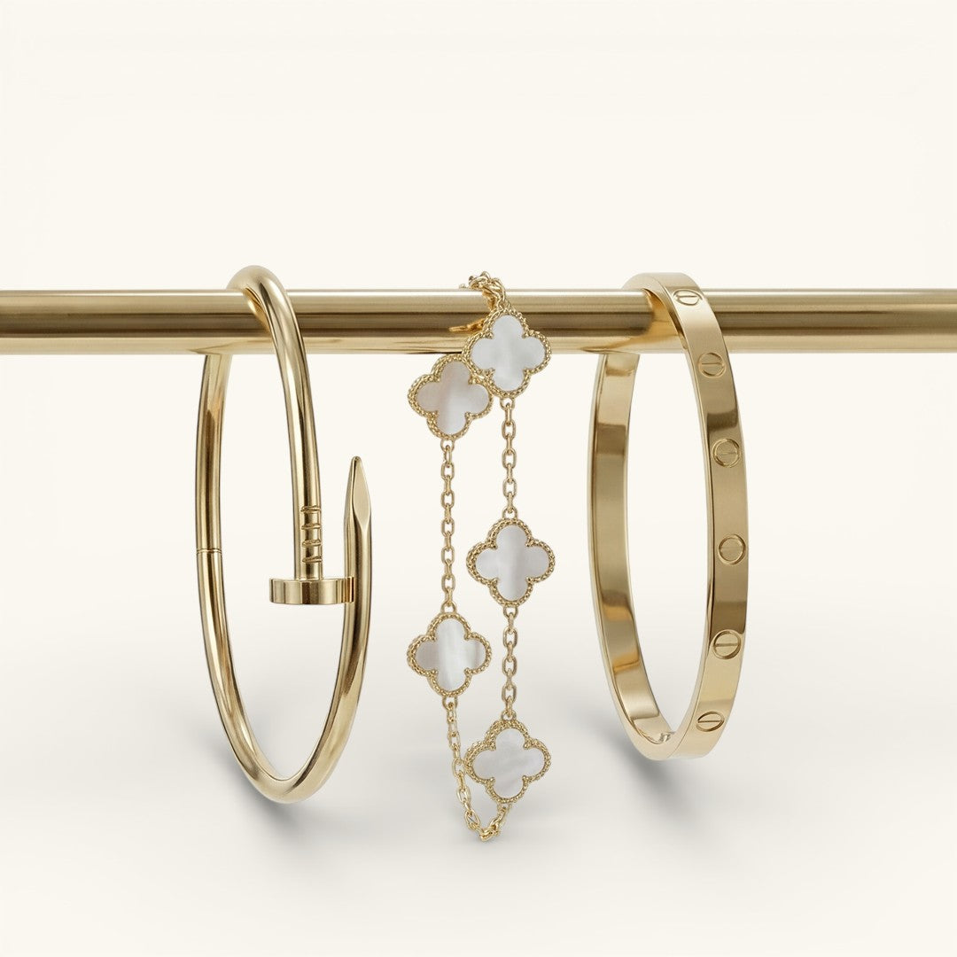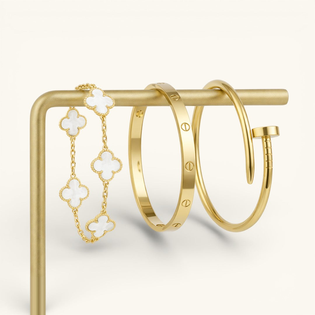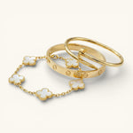 - Trinity & Clover Armband: Een delicate en verstelbare armband (16 + 5 cm) met charmante details, verkrijgbaar in goud of zilver.