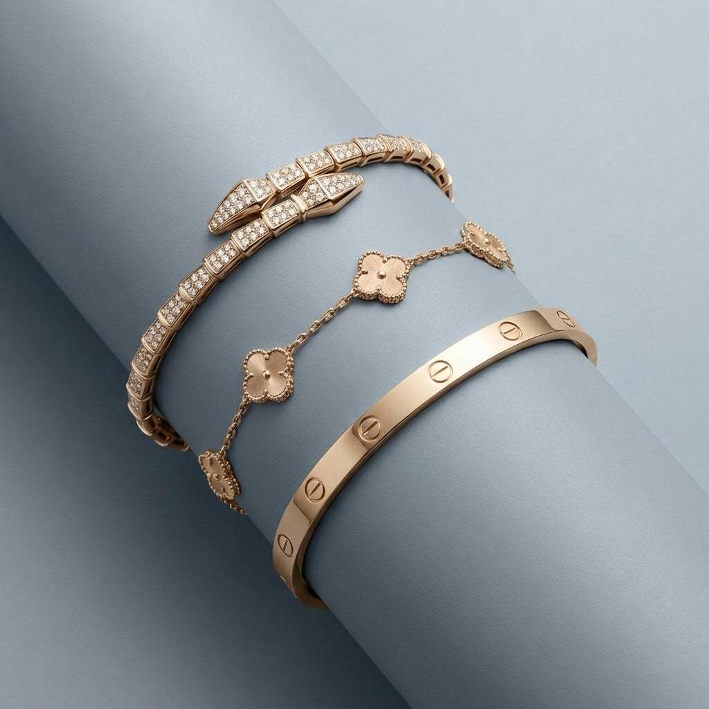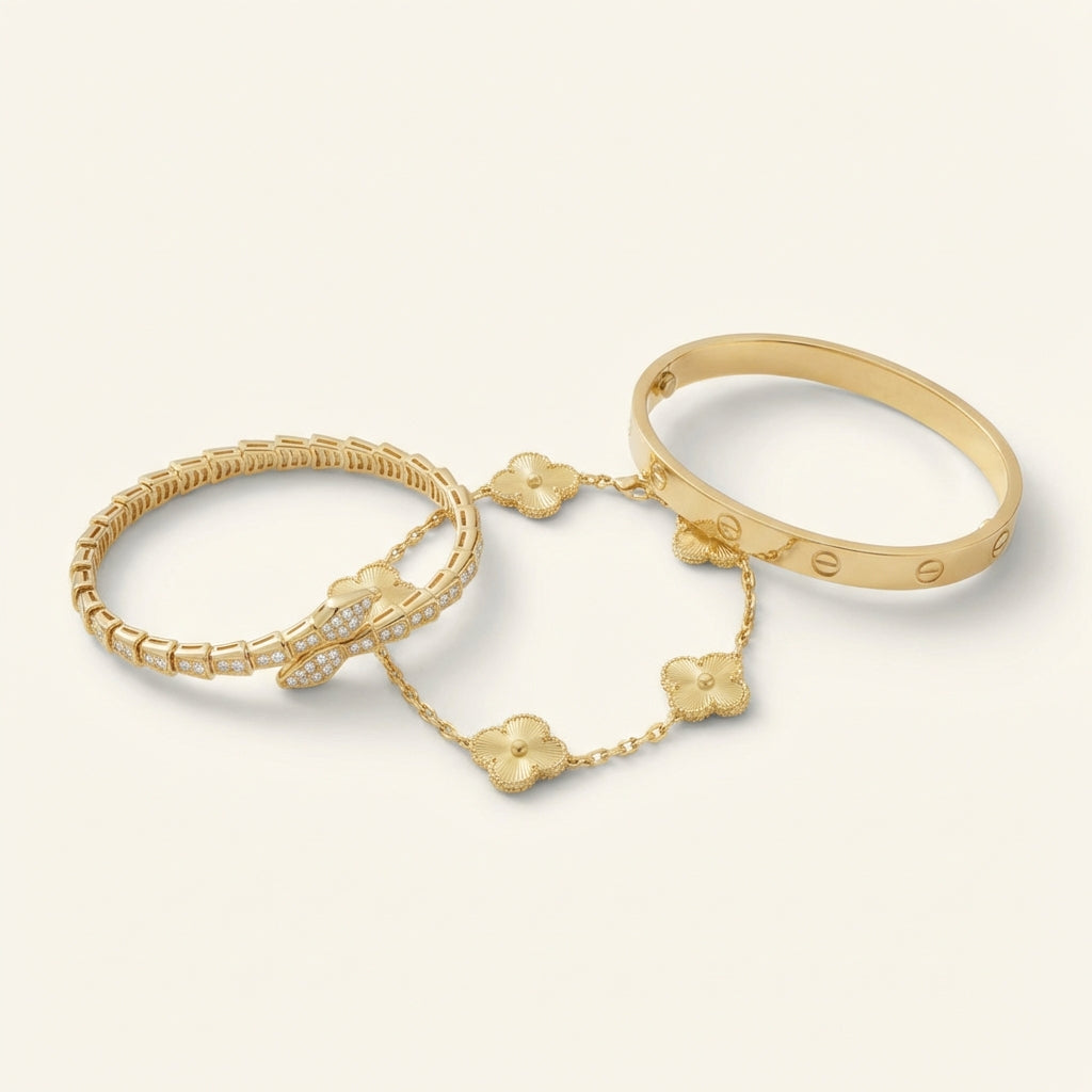 Til je polslook naar een hoger niveau met de Stacks — een zorgvuldig samengestelde set van drie tijdloze armbanden, ontworpen om moeiteloze verfijning toe te voegen aan je look. Perfect om samen te dragen in laagjes of afzonderlijk te stylen; deze collectie biedt veelzijdigheid en elegantie voor elke gelegenheid.